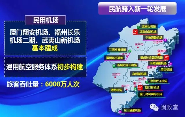 民航計劃完成投資800億,廈門翔安機(jī)場、福州長樂機(jī)場二期、武夷山新機(jī)場基本建成,通用航空服務(wù)體系初步構(gòu)建。全省民航旅客吞吐量突破6000萬人次。
